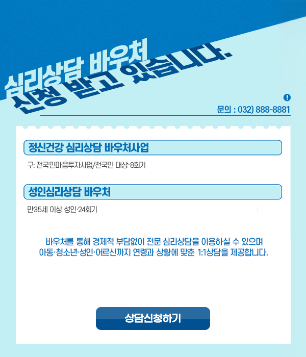 상담바우처를 통해 경제적 부담없이전문 상담을 이용하실 수 있도록지원합니다.